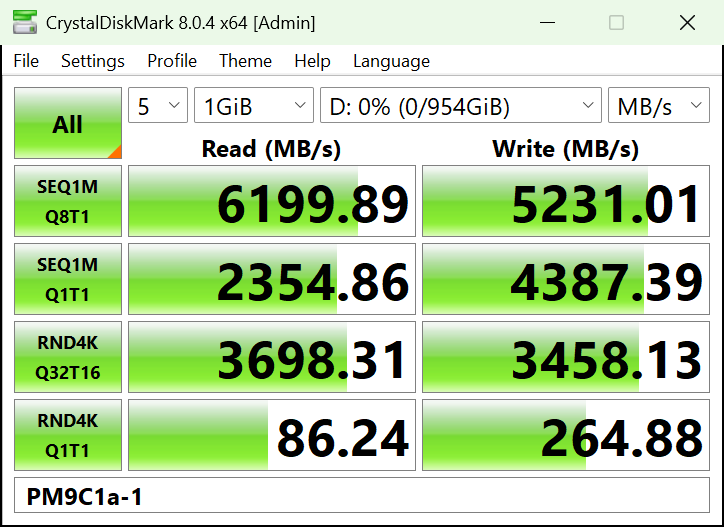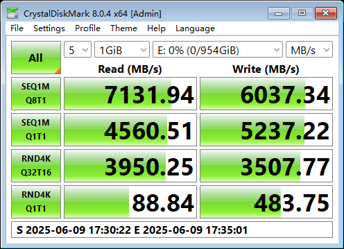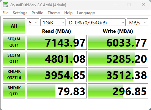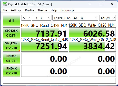 在CDM的嚴苛測試考驗之下,AM541 1TB版本的固態硬盤表現優秀,其連續順序讀取速度達到7143MB/s,超出了產品規格宣稱的7000MB/s;而連續順序寫入速度達到了6037MB/s,也超過了產品規格宣稱的5600MB/s。而隨機讀寫的IOPS分別達到了988k(3954MB/s)和878k(3512MB/s),遠超過了產品規格宣稱的800k。CDM的實測結果表現了該款產品對消費級客戶在參數指標上的誠意滿滿。