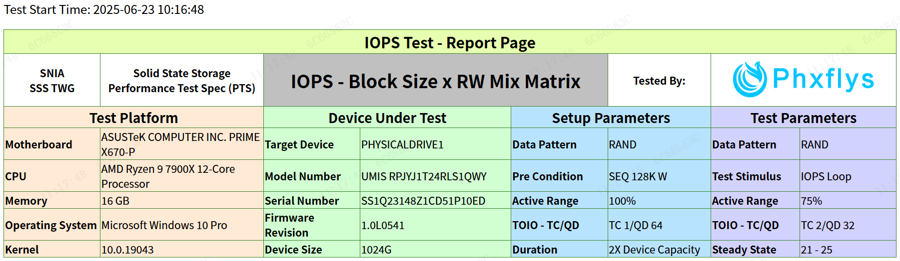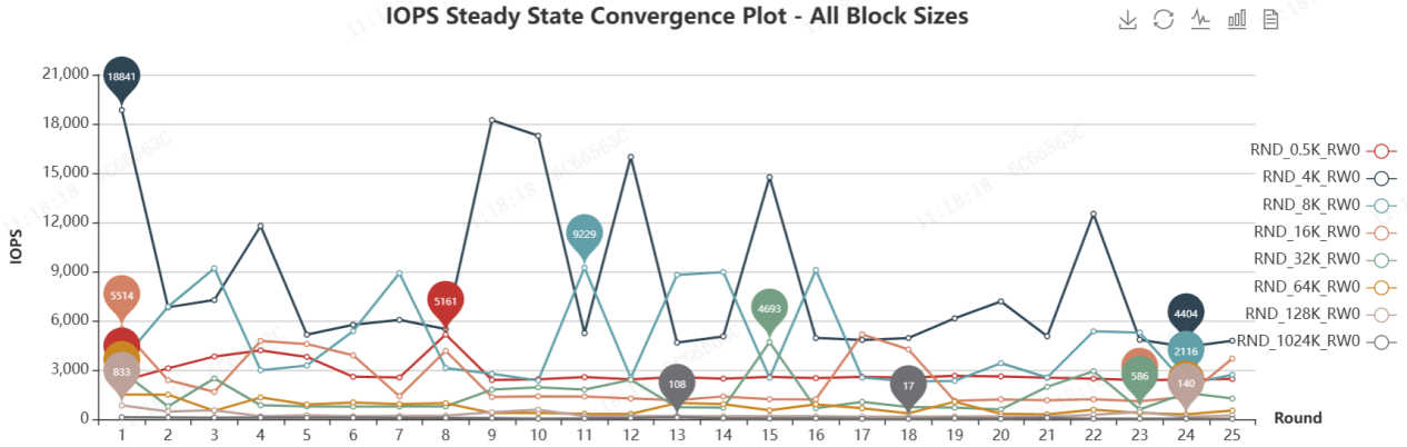SNIA IOPS測試用于評估SSD的隨機讀寫性能,覆蓋了多種讀/寫混合比例(RW Mix)和塊大小(Block Size, BS)的組合。IOPS測試總體信息如下:
