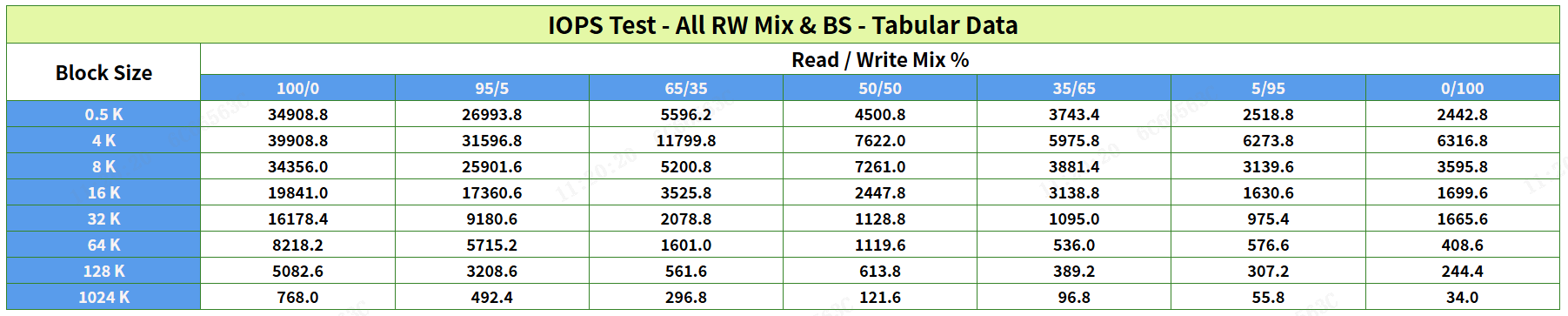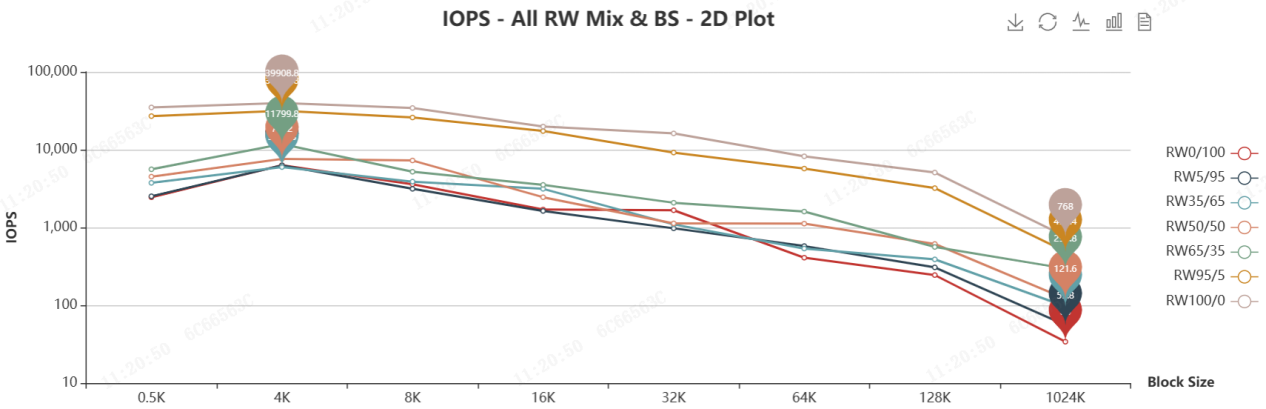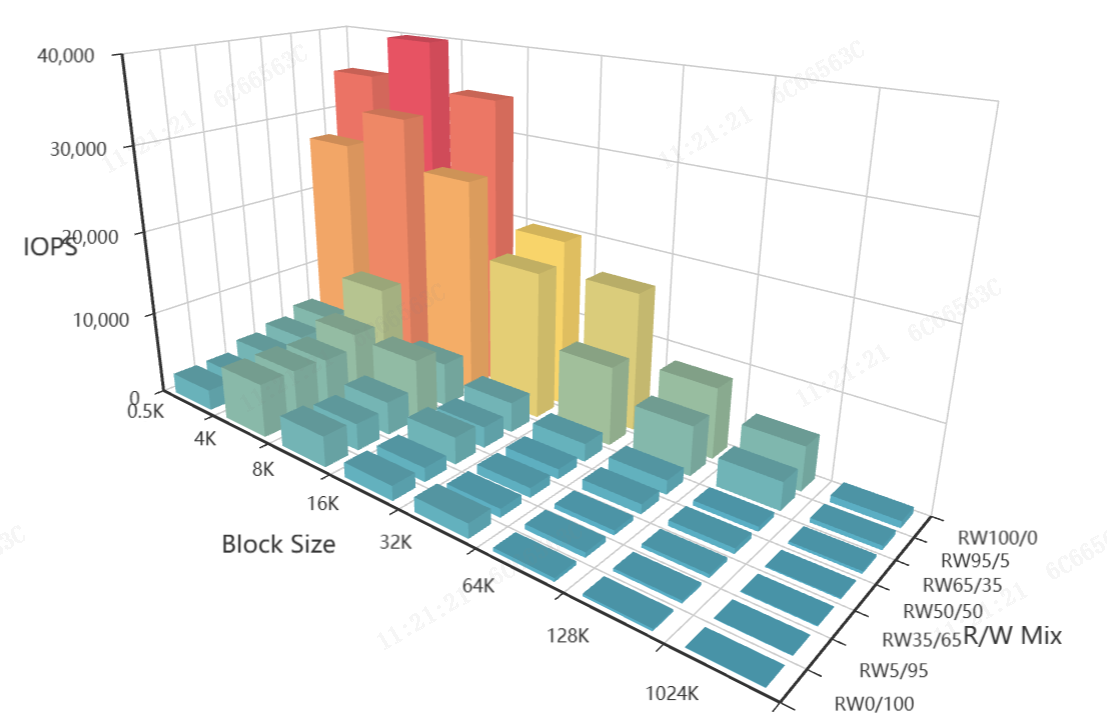 IOPS測試通常包括7種讀寫混合比例(從100%讀到100%寫)和8種塊大小(從0.5KB到1024KB)。