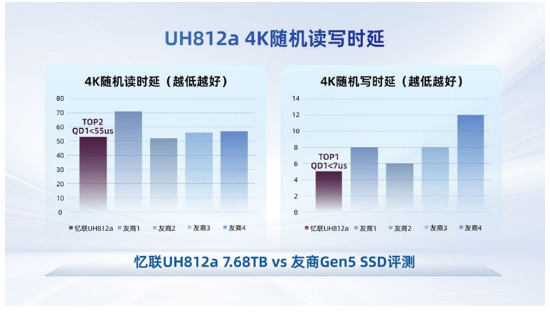 穩(wěn)定低延遲:憶聯(lián)UH812a的超低時延特性突出。4K隨機讀QD1時延<55μs,相比上一代(PCIe 4.0 SSD)改善43%,對比國際友商優(yōu)25%,4K隨機寫性能位列友商TOP1。無論是運行復雜的模擬程序還是處理海量數據集,都能達到微秒級響應,為高性能計算與數據密集型應用筑牢根基。